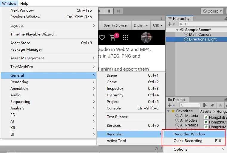 安装完之后,就可以通过菜单栏(Window > General > Recorder > Recorder window)打开录制窗口。