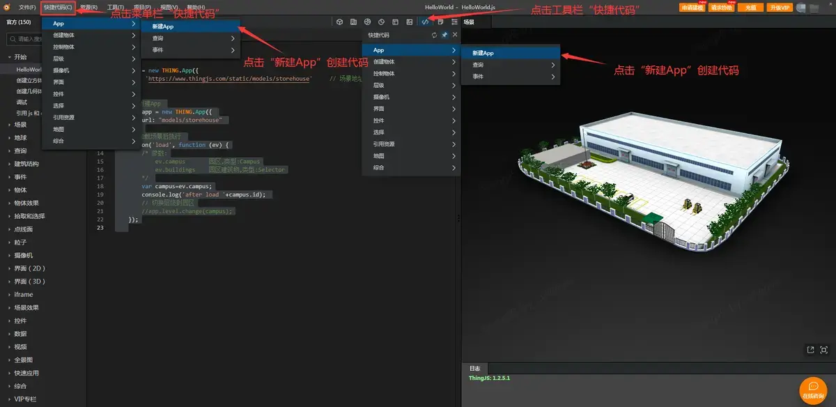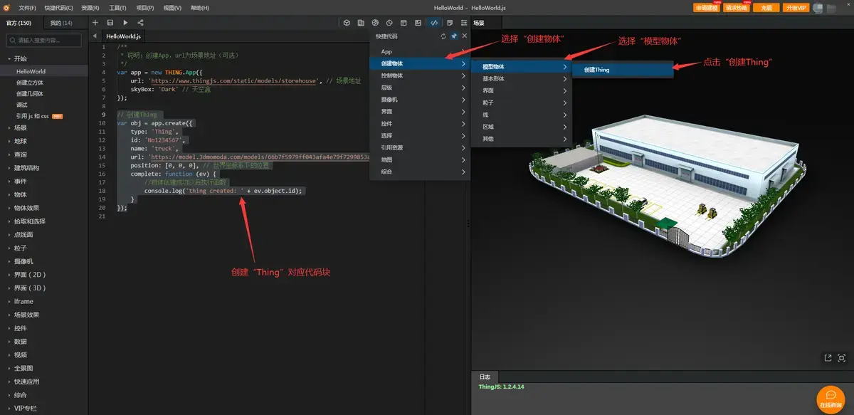 ThingJS平台为用户提供了以下两种方式搭建场景: