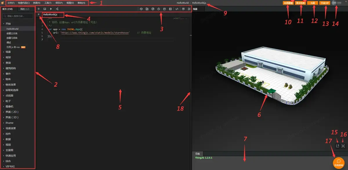 视图:通过切换日志、3D容器和目录(项目列表)的显隐状态以及切换视图风格改变在线开发环境的界面布局。详细介绍请参照 在线开发 - 菜单导航 - 视图管理。