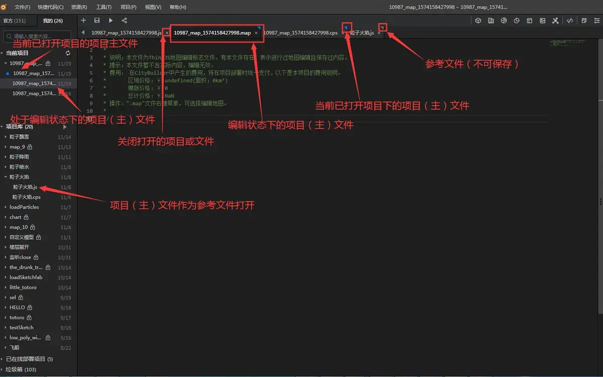 切换个人项目时,选中其中任一项目,右键选择“打开项目”,编辑器和3D容器将分别显示该项目的内容及场景,且项目及项目下的文件将显示在“当前项目”目录下。用户可编辑修改当前项目及项目下的文件。