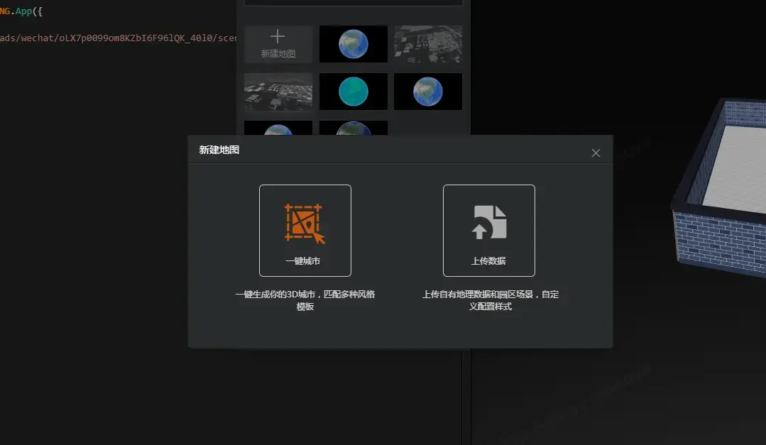 选择“一键城市”和“上传数据”中的任一选项。若选择“上传数据”,地图面板将同时新增一个地图资源;若选择“一键城市”,需选择“城市范围”和“模板”并点击“下一步”,待数据下载完成之后,点击“进入编辑”,地图面板将新增一个地图资源