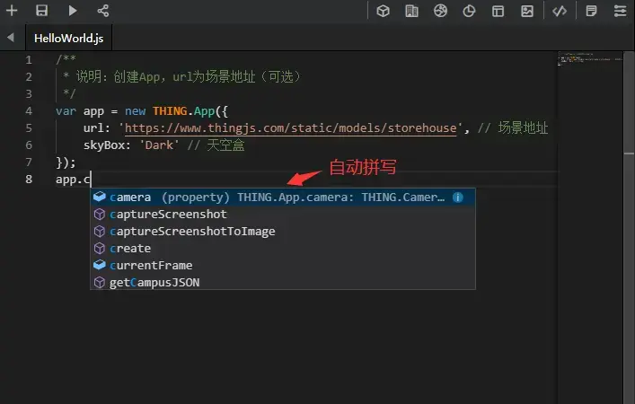 快捷代码:为提高项目开发效率,ThingJS提供了的功能模块,点击快捷代码中的内容,编辑器将插入对应功能的代码。也可通过点击工具栏中的快捷代码图标进行相应操作。详细介绍请参照 在线开发 - 菜单导航 - 快捷代码。
