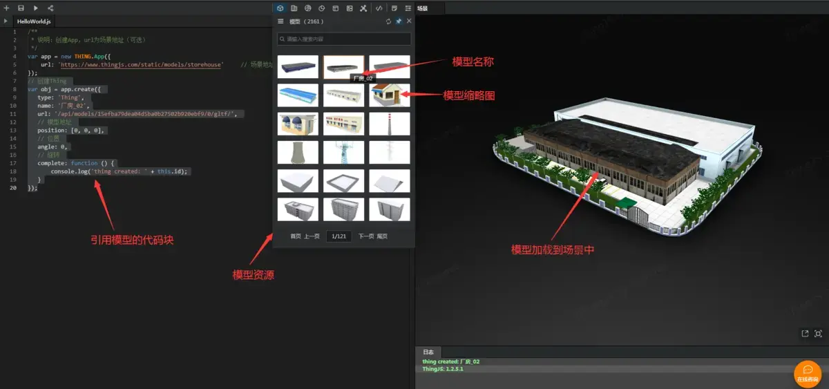 模型:显示模型资源面板,面板中的模型资源由ThingJS提供的官方模型及用户选择或上传的模型构成