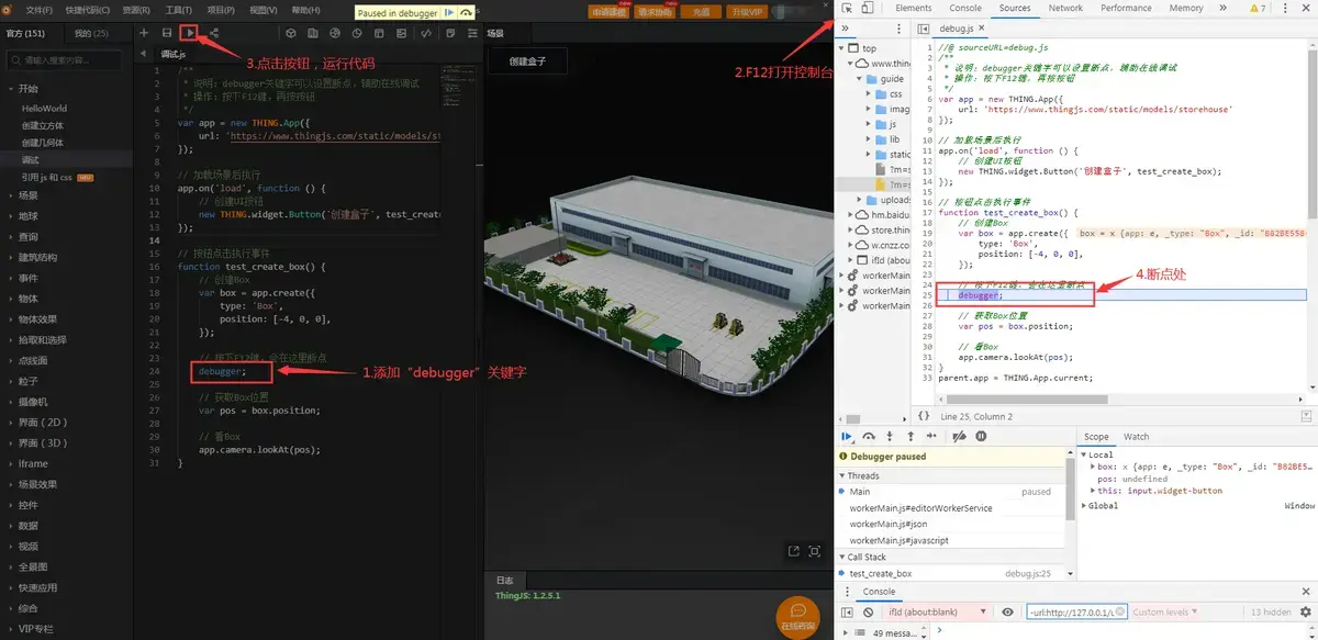 ThingJS 在线开发环境中可以通过在代码里加入 “debugger” 关键字进行调试,调试步骤如下: