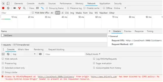 在开发工具 Network 中可查看请求情况,下图展示了跨域相关报错: