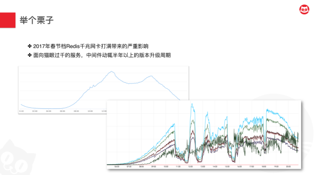 - 在稳定性这方面,2017年春节档Redis千兆网卡打满带来的严重影响,我们常规时候的流量曲线会有两个规律的早晚高峰,而大家可以看到,在故障当天,因为网卡打满导致了非常长时间的服务不可用。这也是猫眼经历过的一个非常重大的事故。