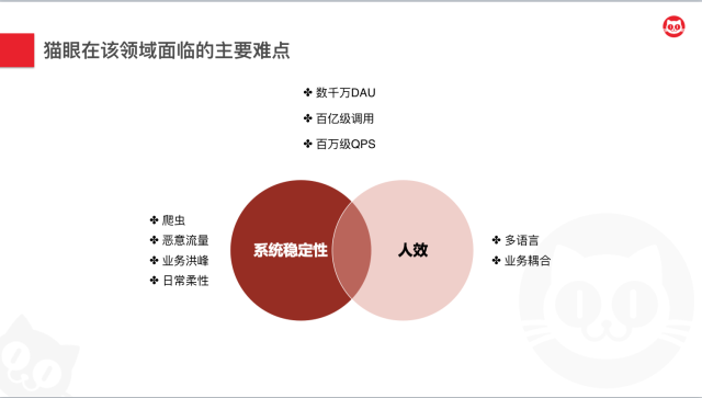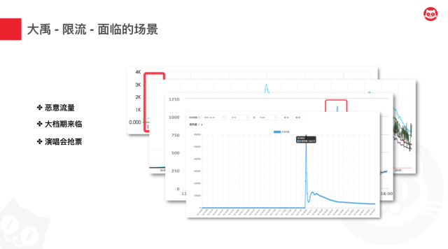 - 从系统层面来说,主要面临的是系统稳定性的问题。大家都知道,每一家公司都会有一些数据资产是很敏感的,所以需要对于一些爬虫和恶意流量进行准实时的处理。另外,猫眼娱乐作为一个全娱乐领域的平台型公司,也会承载业务在大档期和大活动中流量几倍、十倍甚至百倍千倍的压力爆发,如何在这种情况下,保障系统的可用性,也是一个值得研究的问题。以及,故障是无法避免的,无论流量高低。所以如何保障系统的日常柔性可用,也是需要关注的问题