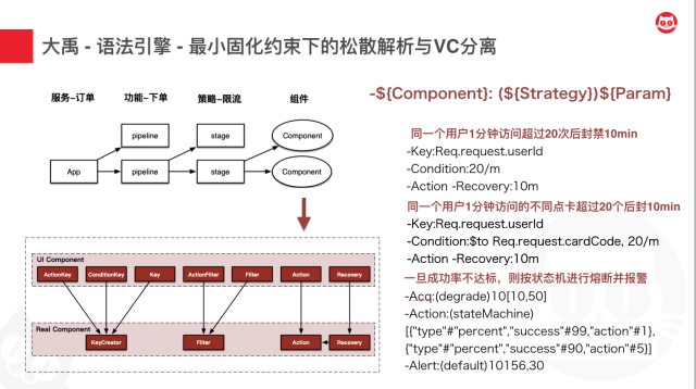 我们接着看,可以看到实际中,我们可以定义很多策略组件,比如特征维度、过滤器、动作、条件判断、恢复策略等等。而这些策略你可以定义实际组件和视图组件,来让你的语义尽可能地友好。所以你可以看到,有很多组件,他们在视图层和控制层其实是分离的,他们可以是一对一、多对一、一对多的关系。这样就可以让你的视图层尽可能友好的情况下,实现控制层最大程度的精简。
