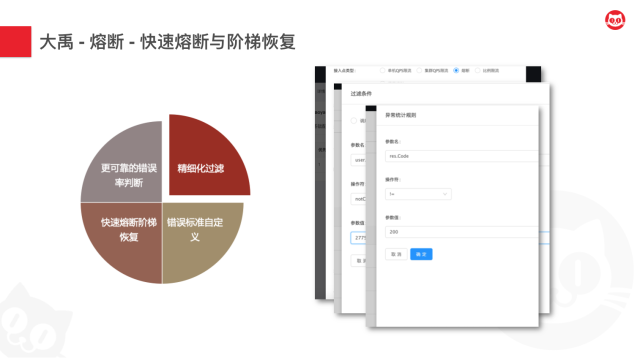 - 同时为了避免快速恢复导致服务雪崩,因而我们采用了阶梯式的熔断策略。有点类似于开手动挡的车,可以跨档降速,但不能跨档提速。通过这种方式,我们提供了这种快速熔断-阶梯恢复的策略。
