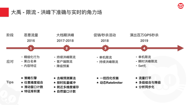 到了下一个阶段的攻防,主要就是流量过载的防御,2017年大年初一的服务雪崩给业务带来了较大影响。大档期洪峰来临后,我们这个阶段要求实时性要进一步提升,而本来的这种异步分析的方式是无法满足我们需求的,我们研发了持续洪峰限流策略,基于去噪预测算法基于过去的历史数据来预测当前时刻的数据,准确率可以达到99.2%。这不到1%的一个qps牺牲来换取0延时的效果,是可以接受的。同时我们采用多级缓存、批量缓冲以及自然窗口计数的方式,进一步降低对Redis的依赖,彻底实现了Redis无热点情况下的集群持续洪峰限流策略。