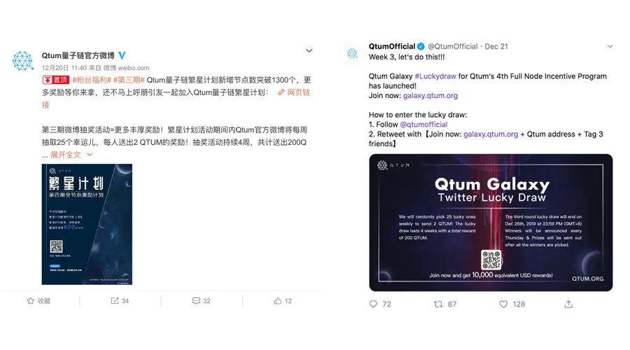 助力Qtum繁星计划圣诞狂欢,Qtum量子链官方微博和Twitter也分别开展了幸运抽奖活动,活动持续四周,每周将抽取25位幸运用户,共计送出400QTUM圣诞礼!