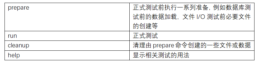 sybench [options]... [testname] [command]testname: 可以指定一个lua的脚本进行测试,或是指定关键字(fileio, cpu,memory)来使用sysbench内置的方法测试相关项目