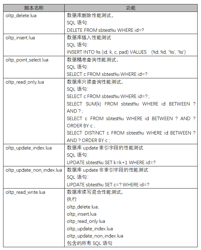当sysbench用于测试数据库性能时,可以通过使用sysbench内置相关lua脚本来快速测试数据库(另外由于sysbench支持自定义脚本,也可以自定义数据库测试脚本,自定义功能本文中不作展开)。