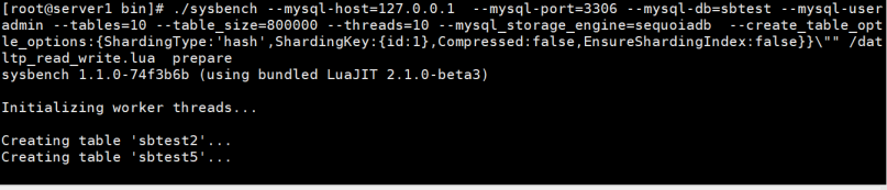 ./sysbench --mysql-host=127.0.0.1 --mysql-port=3306 --mysql-db=sbtest --mysql-user=sdbadmin --mysql-password=xxxxxx --tables=10 --table_size=800000 --threads=10 --mysql_storage_engine=sequoiadb --create_table_options="comment=\"sequoiadb:{table_options:{ShardingType:'hash',ShardingKey:{id:1},Compressed:false,EnsureShardingIndex:false}}\"" /data/sysbench1.1/share/sysbench/oltp_read_write.lua prepare上述命令中--mysql_storage_engine和--create_table_options 指定了建表时使用巨杉数据库引擎创建了hash分区表。如果只是想创建普通表,去除这两个选项即可。