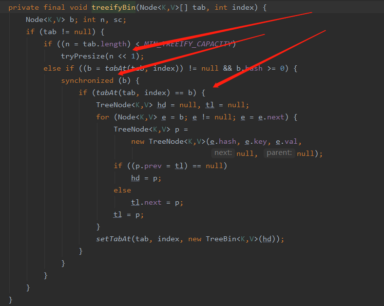 - 为什么是可能呢,因为 treeifyBin 中还需要判断 table.length 如果长度小于 MIN_TREEIFY_CAPACITY 进行扩容,否则才会进行红黑树的转换