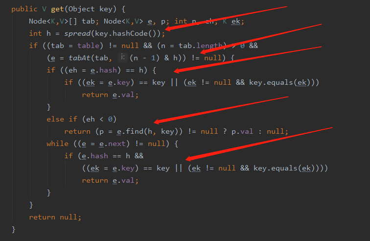 - 否则就是在链表中,遍历链表每一个节点依次判断是否是当前 key 直到找到为止返回