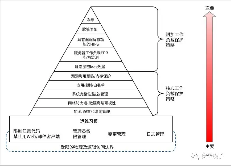 安全能力图也终于迎来一次大的更新。从原来的11个能力删减到8个能力,并且将最底层的“运维习惯”与“加固、配置与漏洞管理”进行了整合。删掉了“欺骗防御”能力,因为欺骗/蜜罐系统是单独产品提供。同时数据的静态加密大部分情况下都有云厂商提供,比如AWS的EBS加密和Azure的磁盘加密,因此“静态加密laas数据”这个能力也从能力金字塔中删掉了。但是加强了对威胁检测和响应的要求,相当于要学习EDR的能力。