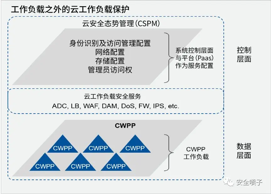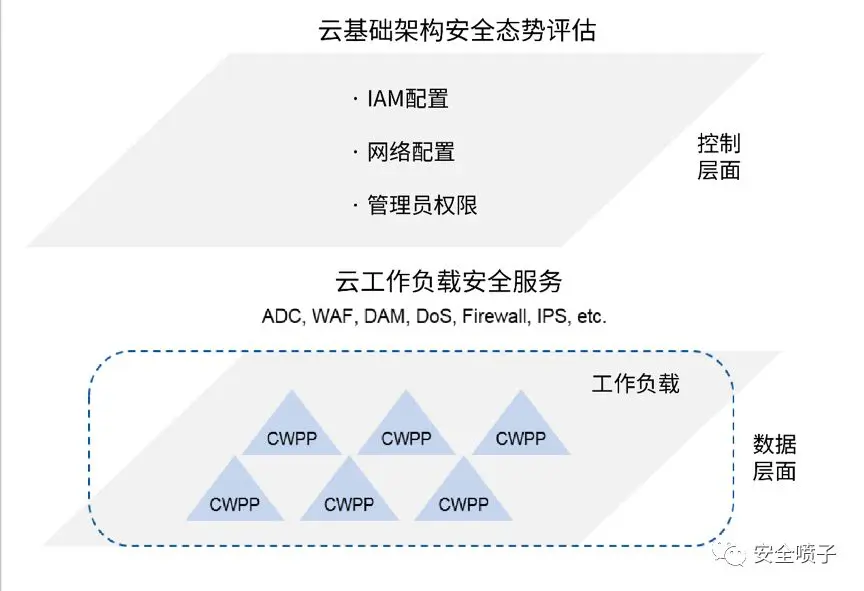 而到了2017年,除了对CWPP产品本身的理解又有了新的进步,也加入了一些外部场景来完善云安全的整个大局观。包括了工作负载外的服务和云基础架构的安全评估。CWPP产品解决了数据层面的问题;而外部的其他服务也是为了保证云工作负载的安全,包括了WAF、Firewall和IPS等。同时加入了控制层面的安全措施,保证云使用上的安全,其中包括IAM配置、网络配置以及管理员访问等。