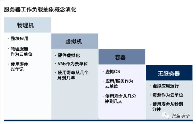 2019年是变化最大的一年。首先将工作负载的外延和内涵进行细粒度解释,根据抽象度的不同分为物理机、虚拟机、容器和Serverless。可以看出这几种工作负载从虚拟化水平到单位的计量再到生命周期都有很大的区别。这样来看,这才是“云工作负载”这一名称真正的意义所在,如果只是服务器安全或者云主机安全,是无法覆盖容器以及Serverless场景的。
