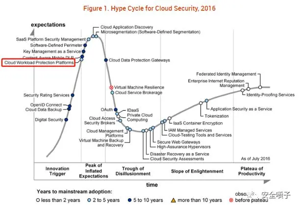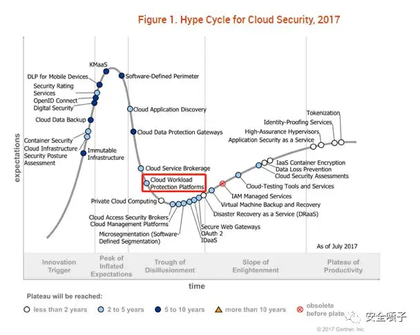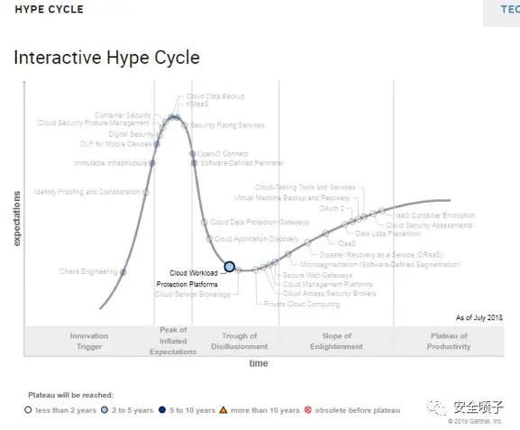 同时从云安全整体的报告也可以看出来CWPP市场已经进入了幻灭期,准备冲刺到成熟上升市场了。近三年的炒作曲线,以及CWPP的位置变化。