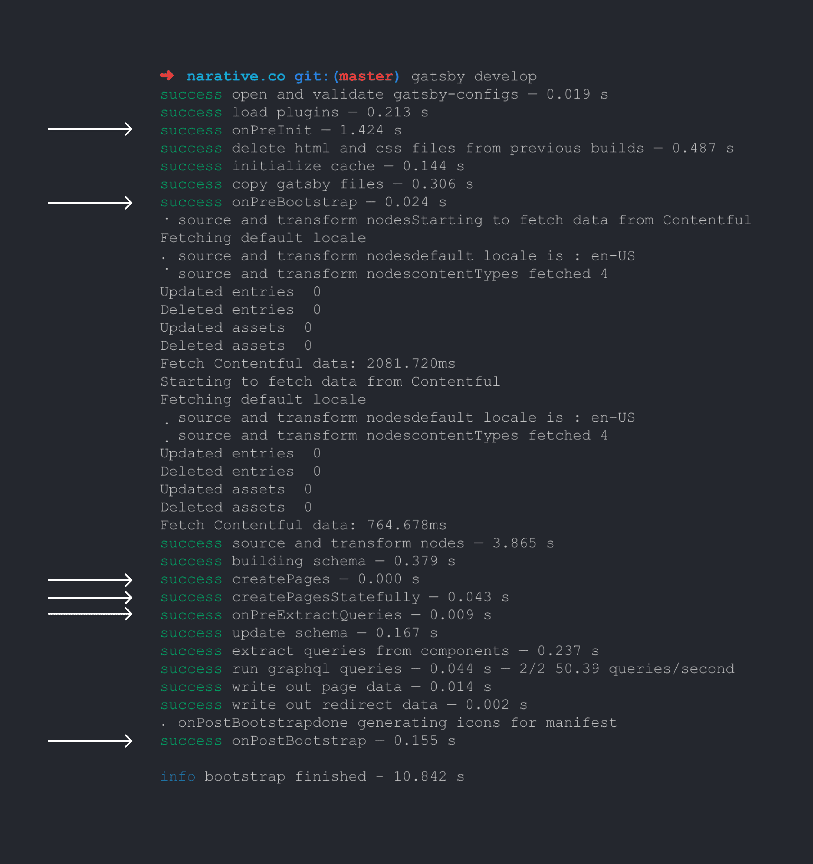 每次运行 gatsby develop 都会有一个引导过程,引导阶段会触发大约 20 个事件,包括校验 gatsby-config.js,构建站点数据图式和页面。例如,Gatsby 会在引导阶段创建页面。如果想要深入了解引导阶段的 20 个事件,Swyx 分享了一个非常棒的 Gist 列举其中细节。