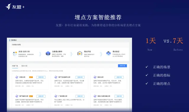 埋点智能方案推荐:某家视频行业领域的公司的有两个团队,分别负责直播不同频道的业务,两个团队都会定义一些公司的埋点规范。但是数据规范性在两个团队不一致,如视频播放开始,A团队定义埋点全局参数叫Play,代表播放开始事件,B团队将其定义为Start。两个团队并不知道两个数据定义都不一致。案例中的问题看似不严重,但后续会发现公司数据不可持续,此时不论利用什么工具都不能解决问题。对于公司数据的管理一定要基于对业务场景的深刻理解,对业务场景进行标准、规范的定义。友盟+通过更多标准化的场景,包括为不同行业提供标准的埋点方案推荐来解决用户问题。友盟+聚合了非常多比较优秀的企业的实践,告诉用户如何埋点,埋点后能够解决哪些场景问题,同时会提供各种各样埋点智能推荐,针对技术团队沉淀公司基于场景的埋点解决方案的知识图谱。