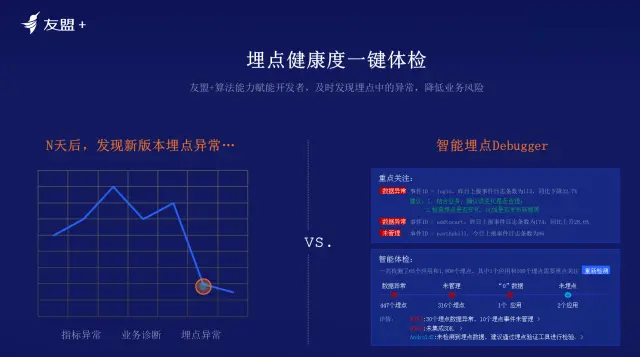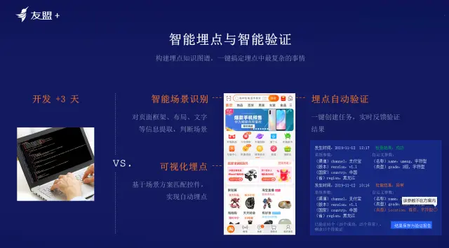 智能埋点与智能验证:开发做埋点是通过SDK代码,上报数据,后台打印日志。但并不意味数据上报则完成了埋点。如开发者直接将一个启动的日志埋在登录页面,突然有一天发现登陆数高于页面访问数近一倍。原因是该点同时被埋到了退出页面的加载进程中。即开发者错将一个点埋到两个位置。友盟+希望能够提供各种智能验证工具,比如当埋点上报时,会为开发者提供一个服务,如果埋点命名为“启动”,会有一系列的智能检测该埋点上报时所在的页面截图是否为正确的业务场景位置。智能埋点及其验证测试是非常重要的,友盟+会通过视觉切图计算验证埋点的正确性,为技术团队大幅减轻工作成本和压力。