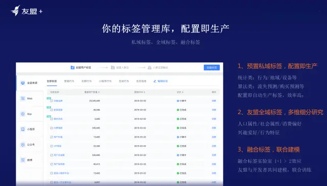 运营团队感到不满,技术团队也缺少成就感,因为每天的工作基本是跑SQL等繁琐零碎的事情。企业需要思考的问题是如何高效解决上述生产场景。友盟+希望数据银行提供预置私域标签的生产,不需要技团队做过多事,只需要将埋点做好。所有产品要去支持运营,能够在平台上面快速配置,快速生产,赋能业务团队,预置私域标签,配置即生产。此外,友盟+数据银行会提供一个不同的能力,既全域标签。私域标签只对客户进行圈选和洞察,友盟+会额外加持全域标签,告知不同用户的兴趣方向,从更多的维度去洞察和圈选用户。友盟+未来计划与其它企业联合建立一个标签实验室,贡献双方不同的数据,通过融合计算得出更好的标签效果以服务不同企业。