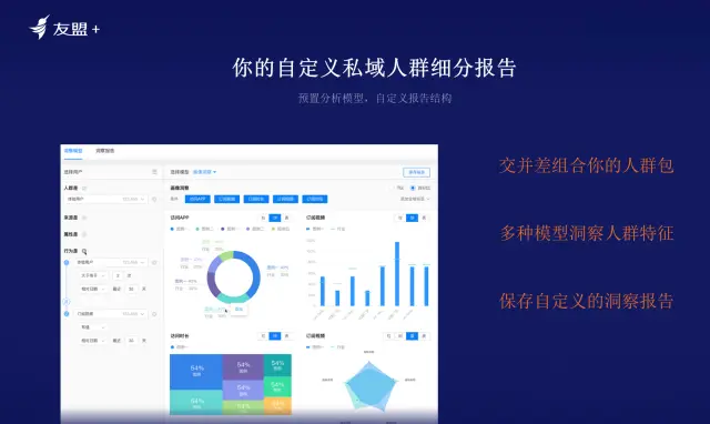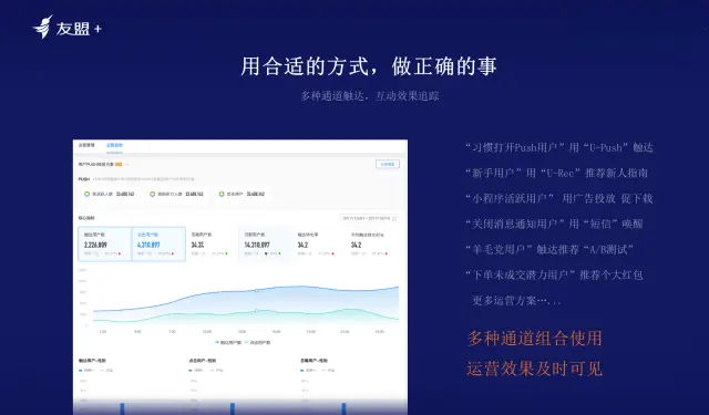 多种组合模式,找到想找的人:如某装修建材公司,有一个Web网站,起初是通过Web网站以及QQ与客户联络。后面该公司又发展了APP和小程序的团队。客户可能同时出现在三处,问题时数据不互通,并且组织是分开运营的。其实本质问题是能否在APP端快速发现小程序的客户,再去客户端做投放,运营和回流。友盟+结合多种模式,无需等排期,帮助运营能找到合适的人。