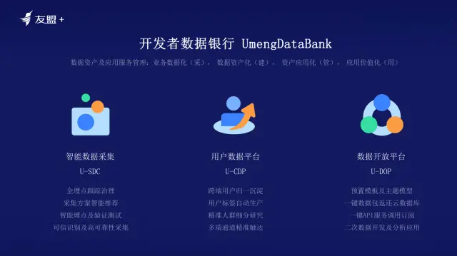 数据银行包括三类产品,从三个角度帮助用户解决问题。如下图所示,第一个产品是智能数据采集(U-SDC),第二个用户数据平台(U-CDP),帮助企业沉淀数据资产,高效服务业务部门、运营团队、市场等团队。第三个是数据开放平台(U-DOP),将采集到的数据通过友盟云之上与业务数据进行融合、分析,更全面的洞察用户,更场景化的应用数据。