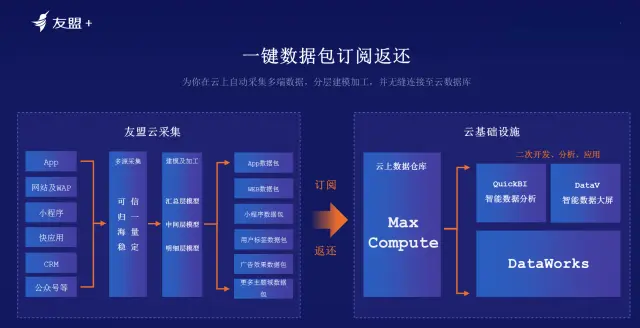 友盟+采集数据后将采集的数据与客户的数据进行融合,通过与MaxCompute进行云端的无缝对接,支持更大力度的开放返还。