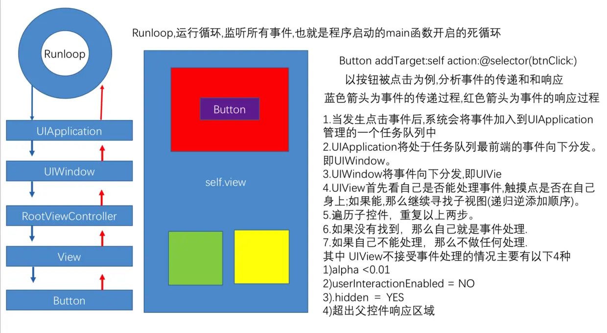 view的控制器存在,就传递给控制器处理;如果控制器不存在,则传递给它的父视图- 在视图层次结构的最顶层,如果也不能处理收到的事件,则将事件传递给