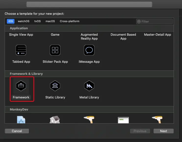 Xcode -> File -> New -> Project,选择Framework,然后Next;