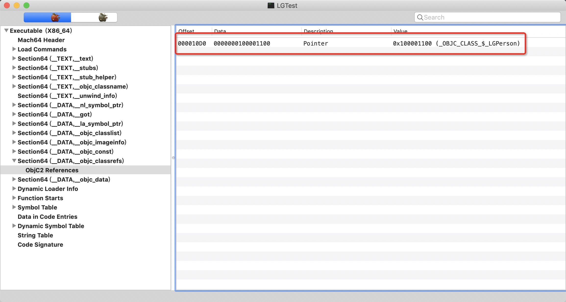 类的实现实在编译期就申请好内存了,所以我们需要可以在编译期查看类的底层实现 编译后通过MackOView可以看到,LGPerson类已经生成