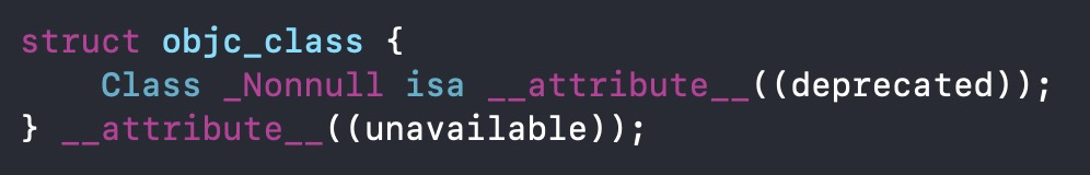 通过clang命令编译main文件后得到cpp文件,可以发现,Class的底层结构是objc_class,里面有一个废弃的isa指针,所以不做研究.