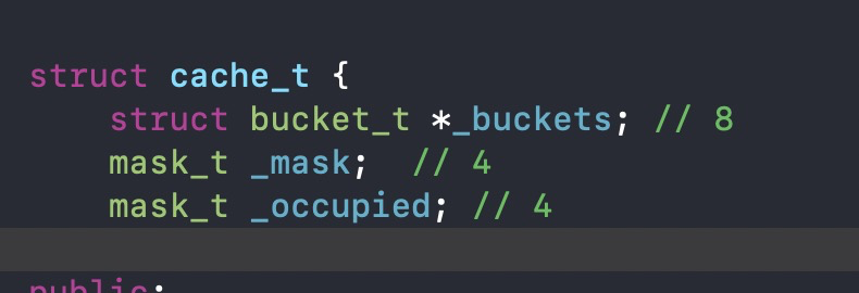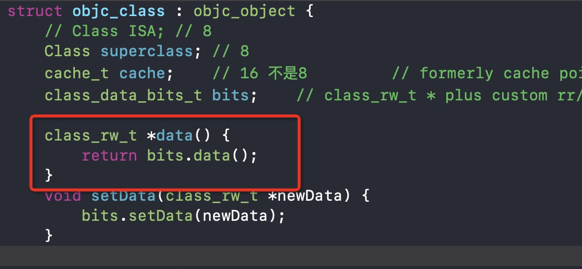cache_t cache为一个结构体,所占字节数也如图所示,共16字节,不足以存放类中的属性和方法,所以,属性方法等数据,一定存储在class_data_bits_t bits结构中