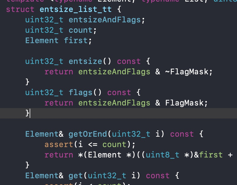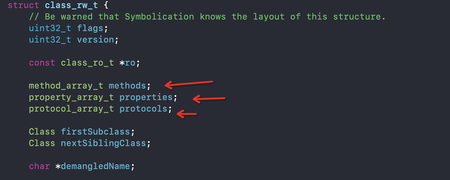 属性方法等数据是存储在class_data_bits_t bits中,并且可以看到class_rw_t中的数据都是来自于此。且结构中存在属性,方法,协议列表等,因此遇到跟踪class_data_bits_t bits,可以通过指针偏移来获取到class_data_bits_t bits中的数据,通过结构可知,在首地址偏移32字节即可得到