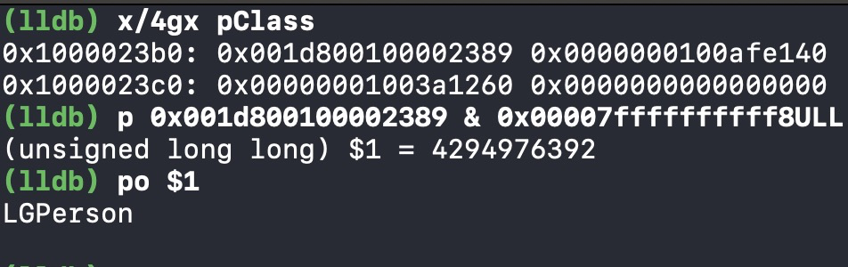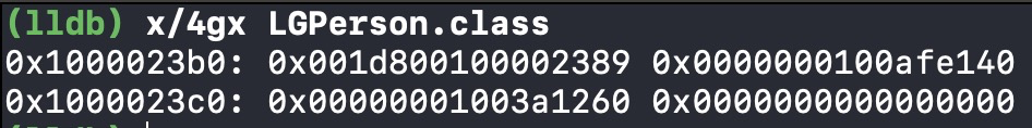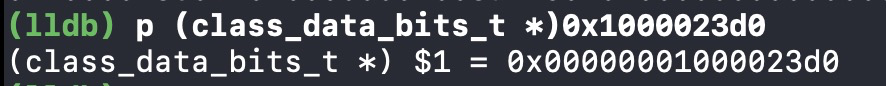 0x1000023b0偏移32字节,在16进制下也就是0x20,得到0x00000001000023d0,由于class_data_bits_t bits不是对象类型,所以需要强转一下,得到如下地址