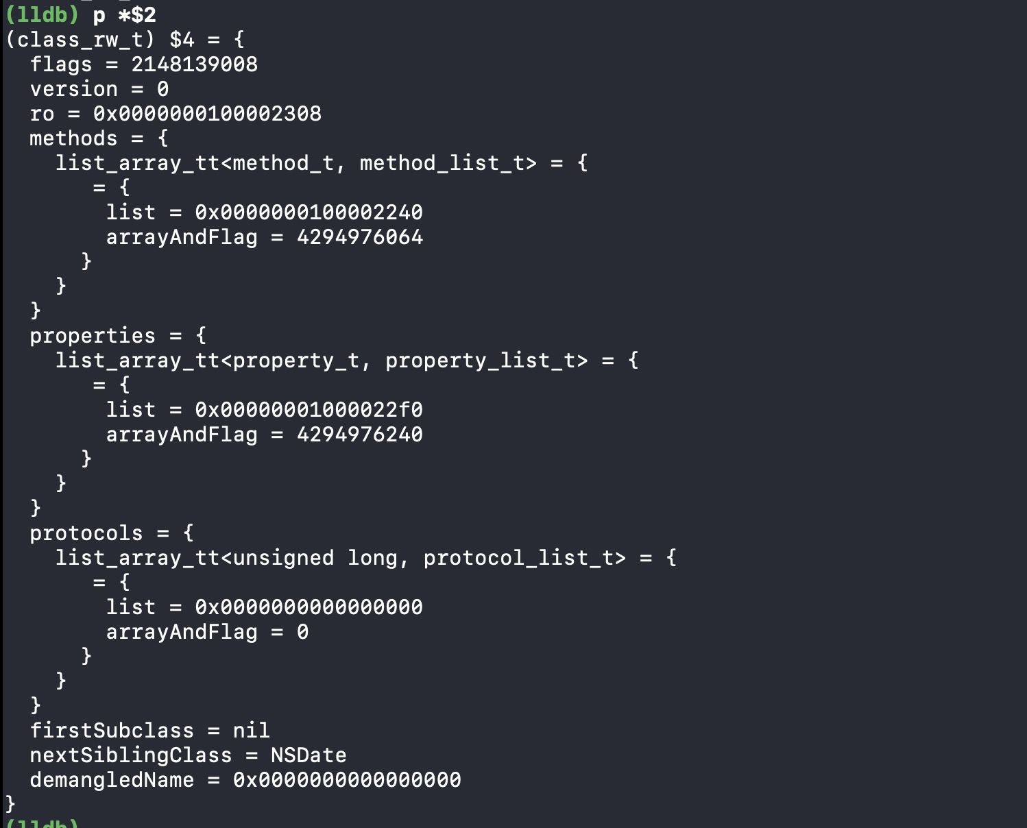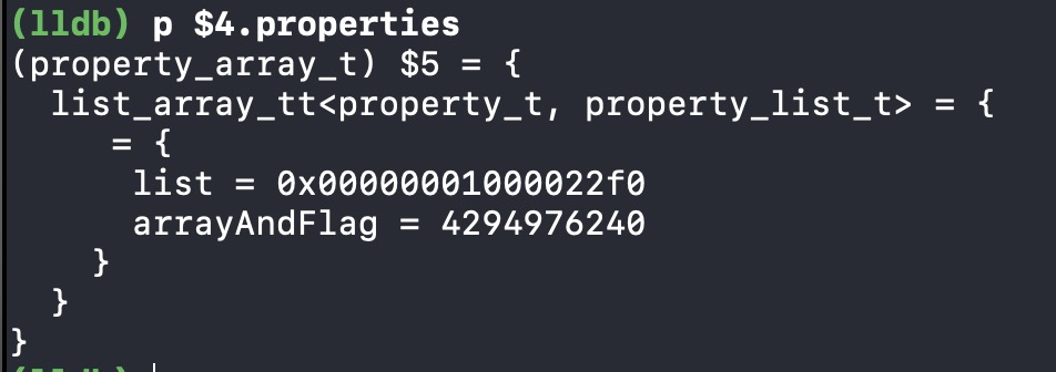 通过上面打印出的class_rw_t中,我们可以看到,根据名称,属性应该是存储在properties中,通过命令打印可得下图