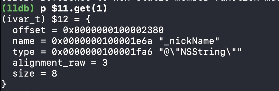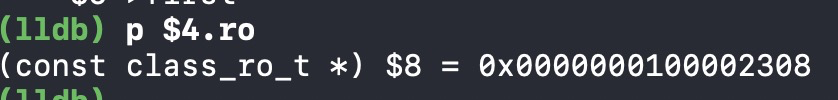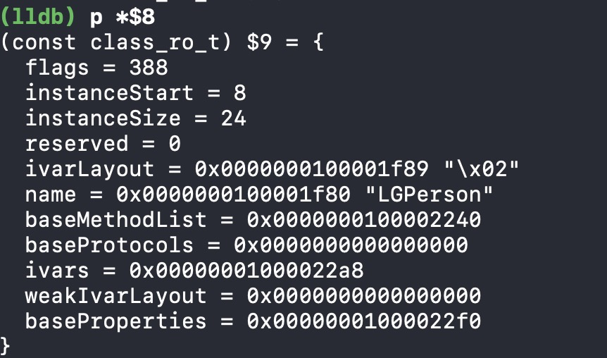 在上述探寻属性的过程中,我们并没有看到成员变量的保存,所以,成员变量不是保存在properties中,应该是存在其他的结构中,根据class_rw_t结构思考可得,ro中存储成员变量的可能性较大,所以按照上述流程探寻ro