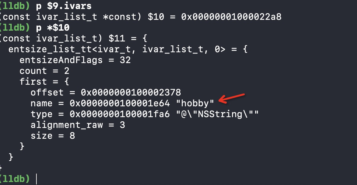 ivars,发现其中first中已经有了我们的属性hobby,验证成功
