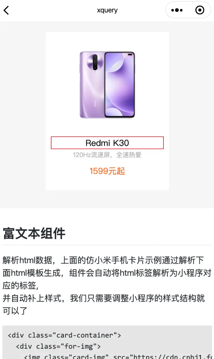 的文档解析组件,支持HTML/MARKDOWN文档解析及输出,下例是仿小米手机卡片效果,结合html及markdown文档输出小程序的结构