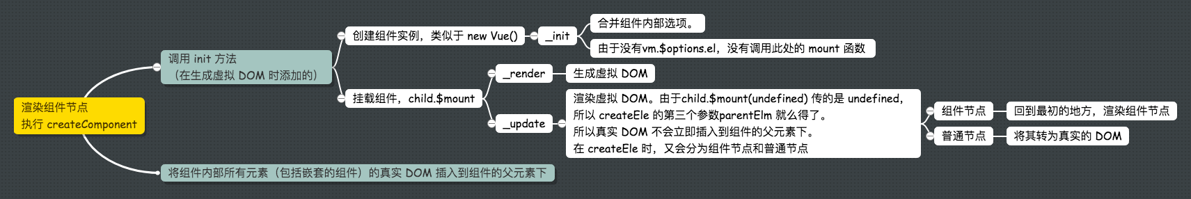 再次执行_init方法时,首先使用initInternalComponent优化合并组件内部选项。然后由于没有 vm.$options.el属性,所以没有使用这里的挂载,而是在 componentVNodeHooks 的 init 中使用 child.$mount 来进行组件虚拟 DOM 的构建和渲染。之后就是执行组件的_render 方法得到组件内部元素的虚拟 DOM,接着是_update方法渲染虚拟 DOM。