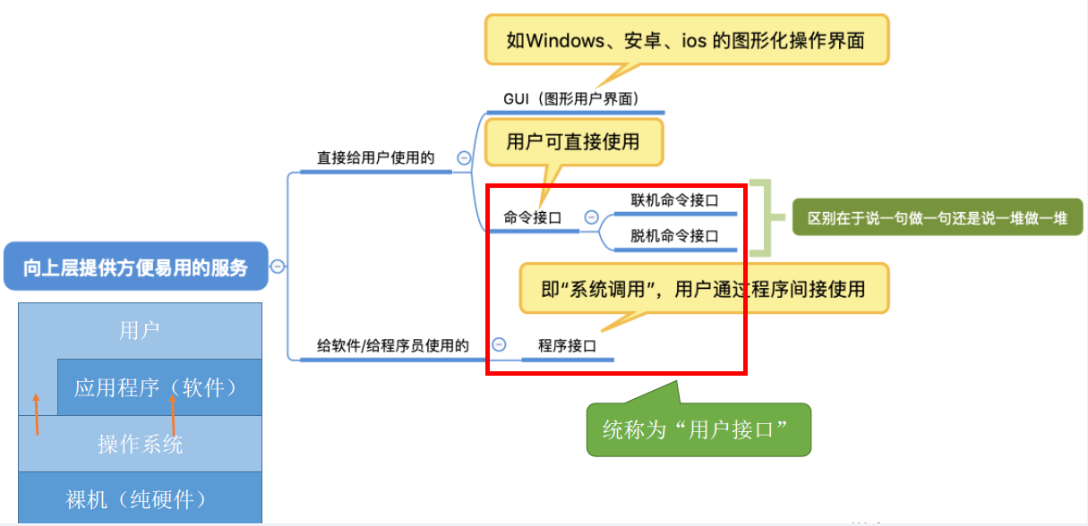 程序接口:可以在程序中进行系统调用来使用程序接口。普通用户不能直接使用程序接口,只能通过程