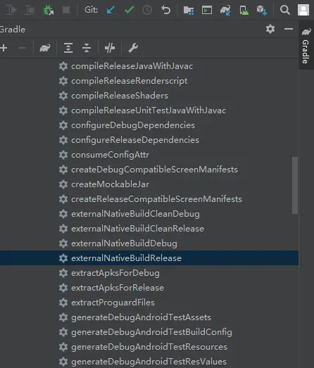 然后点击Android Studio右侧的Gradle窗口中,指定module的externalNativeBuildRelease任务(也可以gradlew执行命令)。