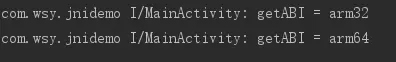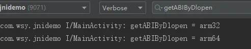 extern "C" JNIEXPORT jstring JNICALL Java_com_wsy_jnidemo_MainActivity_getABIByDlopen( JNIEnv *env, jobject /* this */, jstring libPath) { const char *cLibPath = env->GetStringUTFChars(libPath, JNI_FALSE); void *handle = dlopen(cLibPath, RTLD_LAZY); env->ReleaseStringUTFChars(libPath, cLibPath); const char *abi = "unknown"; if (handle == NULL) { LOGI("lib not found!"); } else { LOGI("lib found!"); getAbiFunc getAbiFunction = (getAbiFunc) (dlsym(handle, "getAbi")); if (getAbiFunction == NULL) { LOGI("function not found!"); } else { abi = getAbiFunction(); LOGI("getAbi by dlopen success, abi is : %s", abi); } dlclose(handle); } return env->NewStringUTF(abi); }分别以
