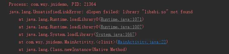 为什么是这个目录,而不是其他目录?这是因为,src/main/jniLibs是Android Studio工程的默认动态库文件存放位置,如果将生成的库放在其他位置,打包apk的时候就不会把库拿过来一起打包,于是运行时就会缺少libabi.so,从而导致crash,如下: