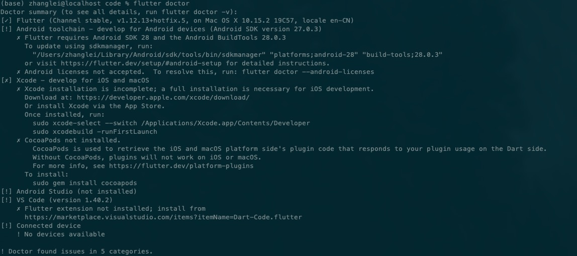 通过自检命令可以看到flutter依赖的内容还有哪些没有安装,并提供安装方法。初次安装完成后会得到一个类似下图的结果: