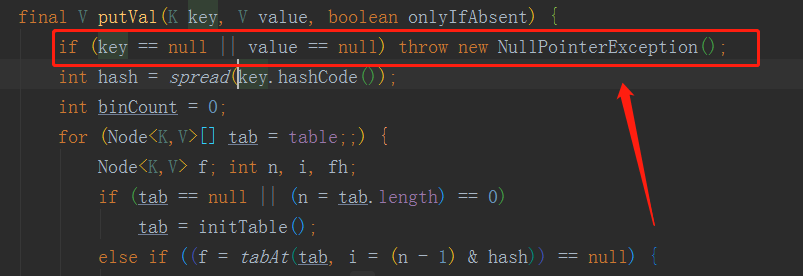 1.HashMap的key、value可以null,并且它也不是线程安全的,它也是无序的,这些要点在hashMap源码的类头上注释部分都可以知道的。那为什么HashMap的key、value可以为null存储到HashMap中去呢?因为在hashMap的put方法没有对这两个进行null值得校验。下面图一为hashMap的putVal方法,其实我们使用的put方法底层调用的就是putVal方法,图二是ConCurrentHashMap的putVal,它会先进行null的校验,key和value为空的时候会跑出异常NullPointerException。图一为:HashMap的putVal方法,图二为:ConcurrentHashMap的putVal方法。