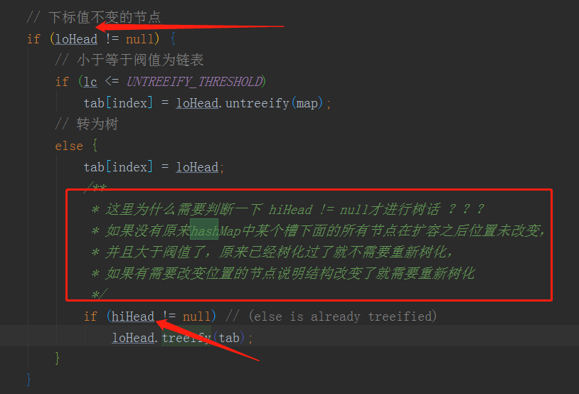 注意如果节点类型Node和TreeNode两者的计算方式有些不同,如果是Node类型的话,说明为链表形式,但是如果TreeNode类型化是树形的,那么就会调用((TreeNode<K,V>)e).split(this, newTab, j, oldCap);这个方法,也是当前桶槽下面遍历所有的树形节点,不需要移动的元素置入loHead为首的链表,需要移动的元素置入hiHead为首的链表,计算两个链表的node大小,如果小于等于UNTREEIFY_THRESHOLD(值为6)就将树转化为链表,且类型从TreeNode转化为Node类型,如果大于阀值的话需要进行树化。